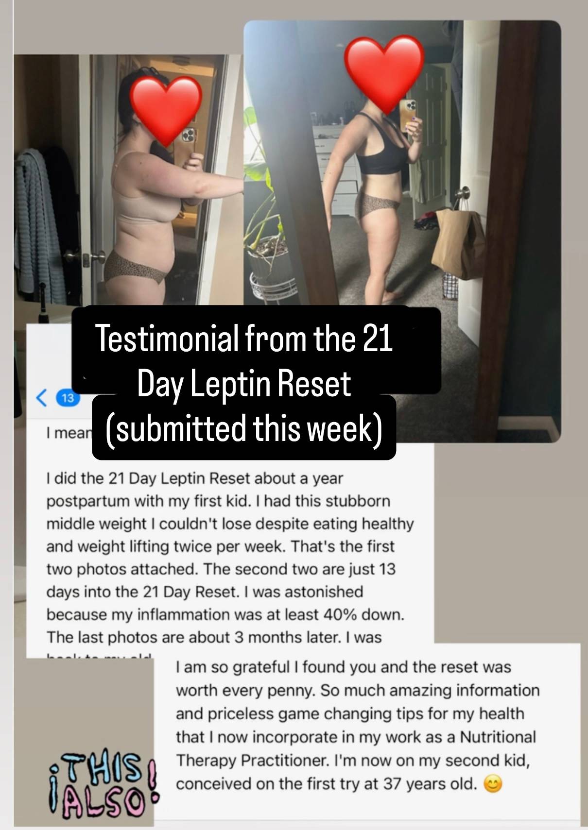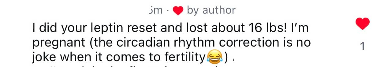 The good news - it's not complicated: When you realign light exposure, mealtimes, and circadian rhythm, your hormones have a much easier time remembering the code. I've seen it (and experienced it) firsthand - hundreds of women reporting: ✨ restored cycles ✨ effortless weight loss ✨ fertility after years of “unexplained” infertility ✨ balanced perimenopause and menopause ✨ deeper sleep and steady energy Here are two testimonials that just came in this week ⬇️⬇️ If this resonates, I teach this entire process inside my Leptin Reset and Leptin Master Plan (advanced level).Y ou’ll learn how to use light, food timing, and circadian signals to reset the hormones that control every other hormone -melatonin, leptin, and cortisol. Join the thousands of women (and men!) who’ve reclaimed their cycles, restored their sleep, and even conceived naturally - just by restoring the timing nature designed. Click here for 15% off the Leptin Reset Click here for the Leptin Master Plan (advanced learners & practitioners) Please feel free to forward this article to a friend or family member who might find this interesting. Reading this on the web or forwarded from a a friend? Click here to subscribe so you don't miss free informative content in the future.Enjoy my work & want to support me? (No pressure as this newsletter will remain free) Leave me a tip!